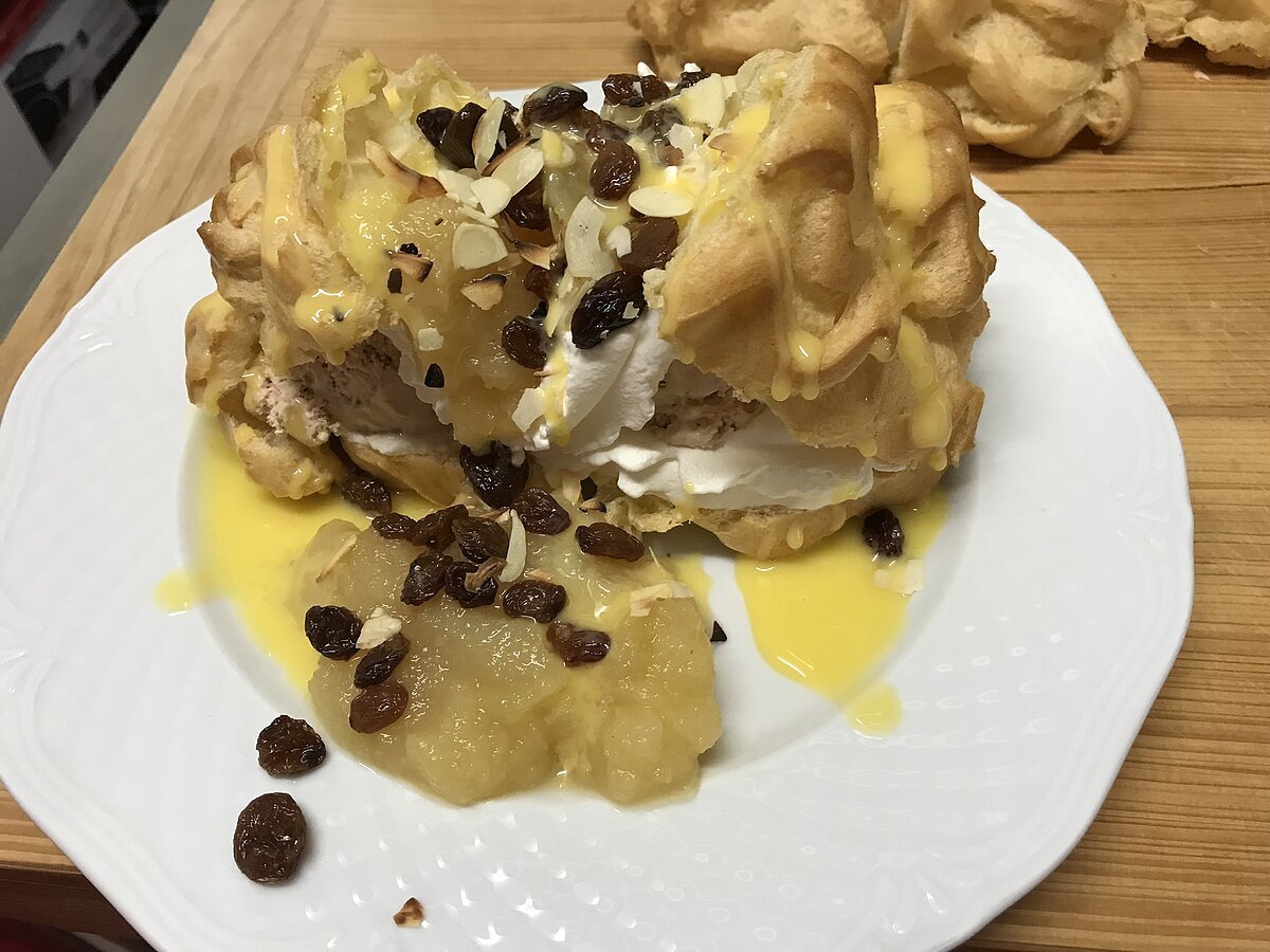 Luftig-leichte Riesenwindbeutel, gefüllt mit verschiedenen Eissorten und hausgemachter Soße vom Feinsten.